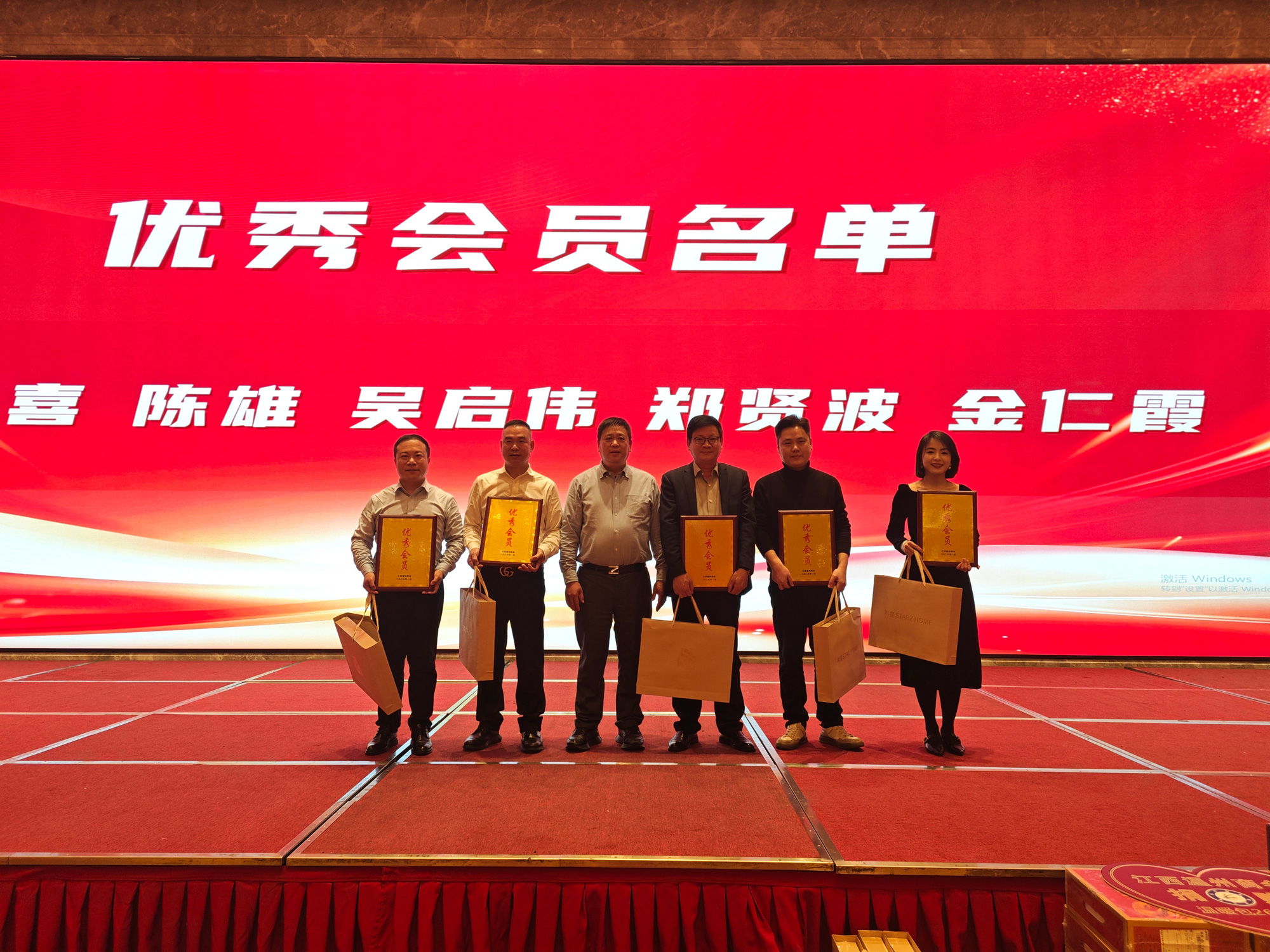接下来是对优秀会员的表彰,他们分别是蔡邦喜、陈雄、吴启伟、郑贤波、金仁霞五位,他们五位不管是新冠疫情期间的捐款捐物,还是对商会年会的赞助,对商会的活动总是积极参与,充分体现了作为一名商会成员对商会的关心和支持。