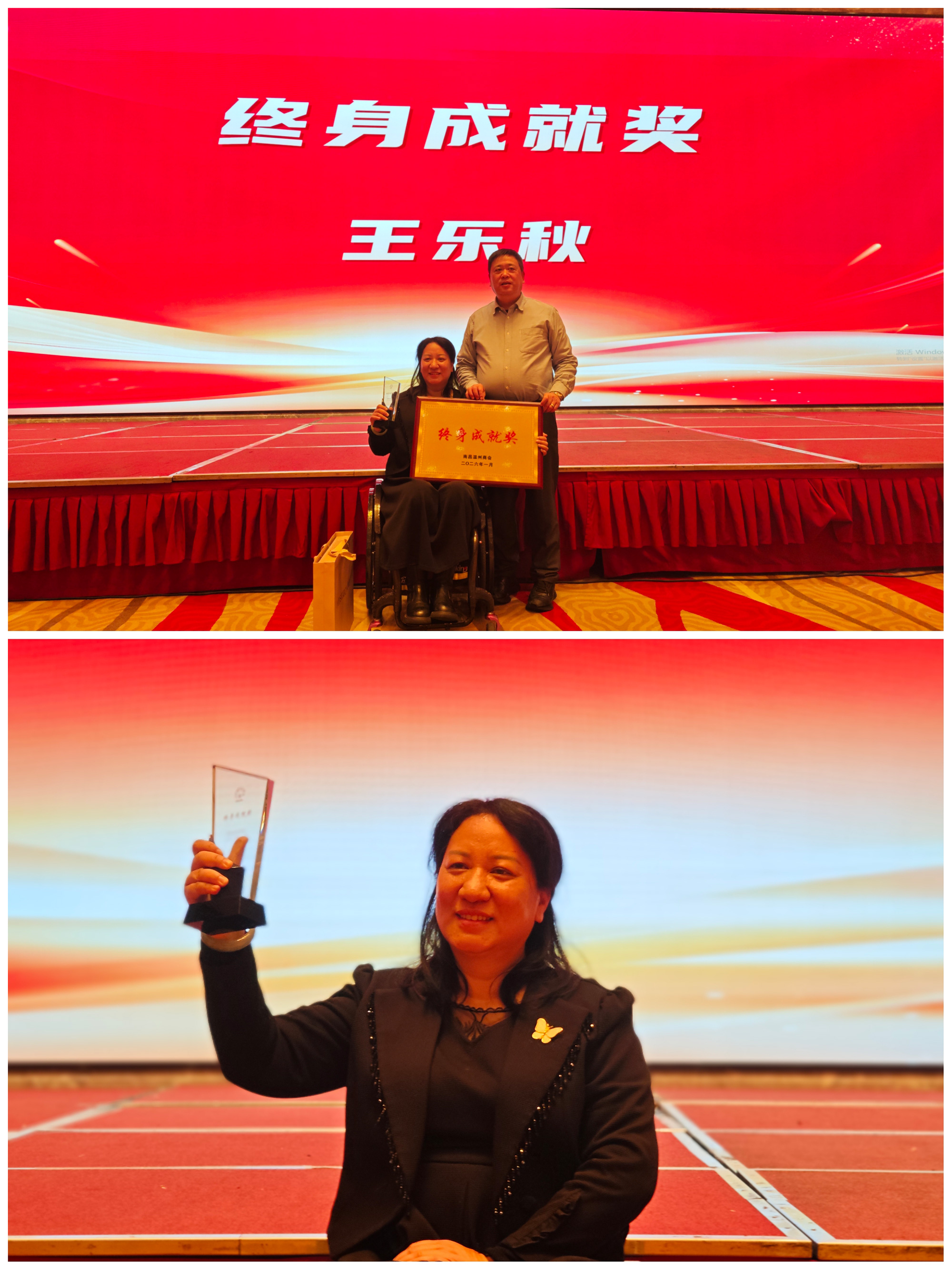 在我们南昌温州商会大家庭中,有位温州乐清女人。作为南昌温州商会创始团队之一,始终鼎力支持商会发展。她作为江西乐秋康复中心创办人,给3000多名脊髓伤友带去温暖。她的事迹被50多家主流媒体专题报道,被央视拍成故事片《轮椅上的阳光》。她就是获得过全国三八红旗手、全国自强模范、2006 年十大浙江骄傲人物等数十项荣誉的王乐秋。为了表彰王乐秋女士长期以来对商会作出的贡献,南昌温州商会授予她“终身成就奖”荣誉。