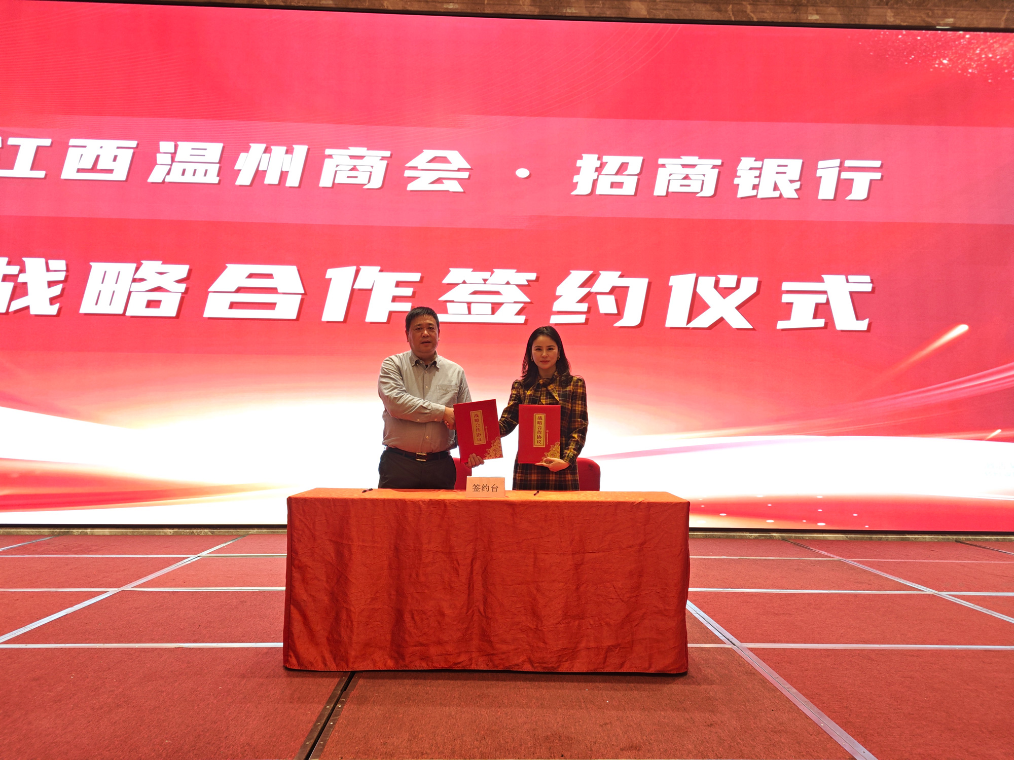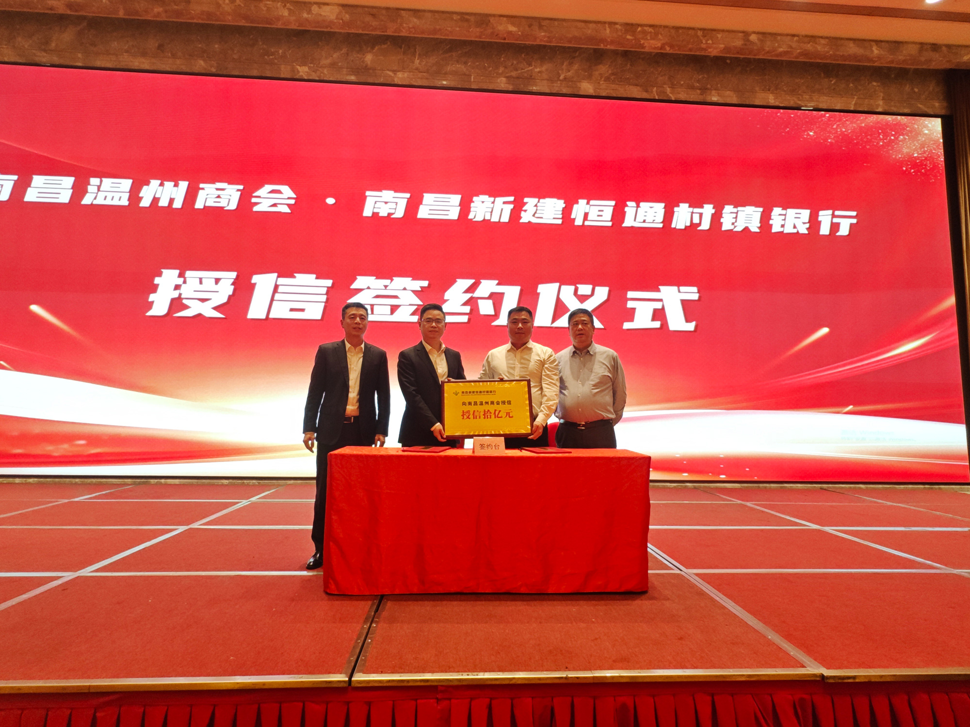 与招商银行红谷滩支行现场进行了战略合作协议的签约仪式。南昌温州商会与新建恒通村镇银行现场签署授信协议,新建恒通村镇银行对南昌温州商会授信十亿元人民币。我们会员在今后的经营中将会得到两家银行在金融上的有力支持,解决大家融资难的困惑。